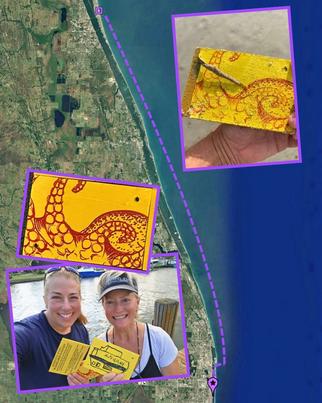Photo E - shows our founder and Amanda Waite of the Angari Foundation deploying drift cards from the C-51 canal in West Palm Beach and this octopus decorated card was found in Sebastian! 112 miles to the north! So, this card traveled through the Lake Worth lagoon, out the Port of Palm Beach inlet and up the Gulfstream to land 112 miles to the north!!!